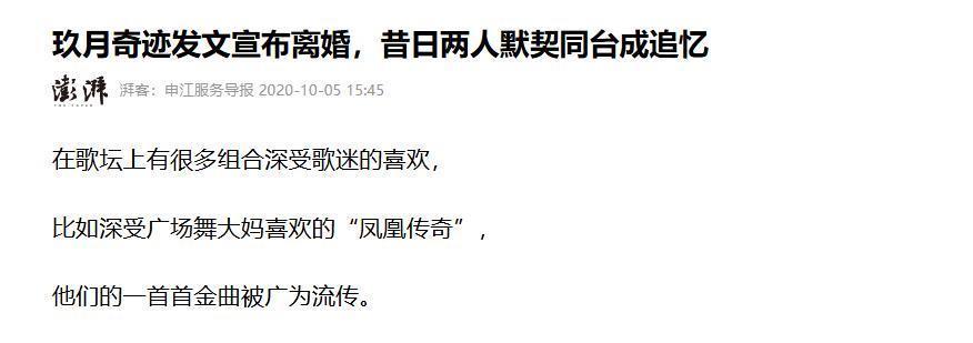 申江服务导报2020-10-05发布《玖月奇迹发文宣布离婚,昔日两人默契同台成追忆》